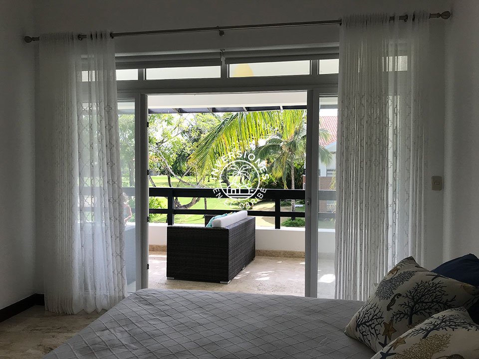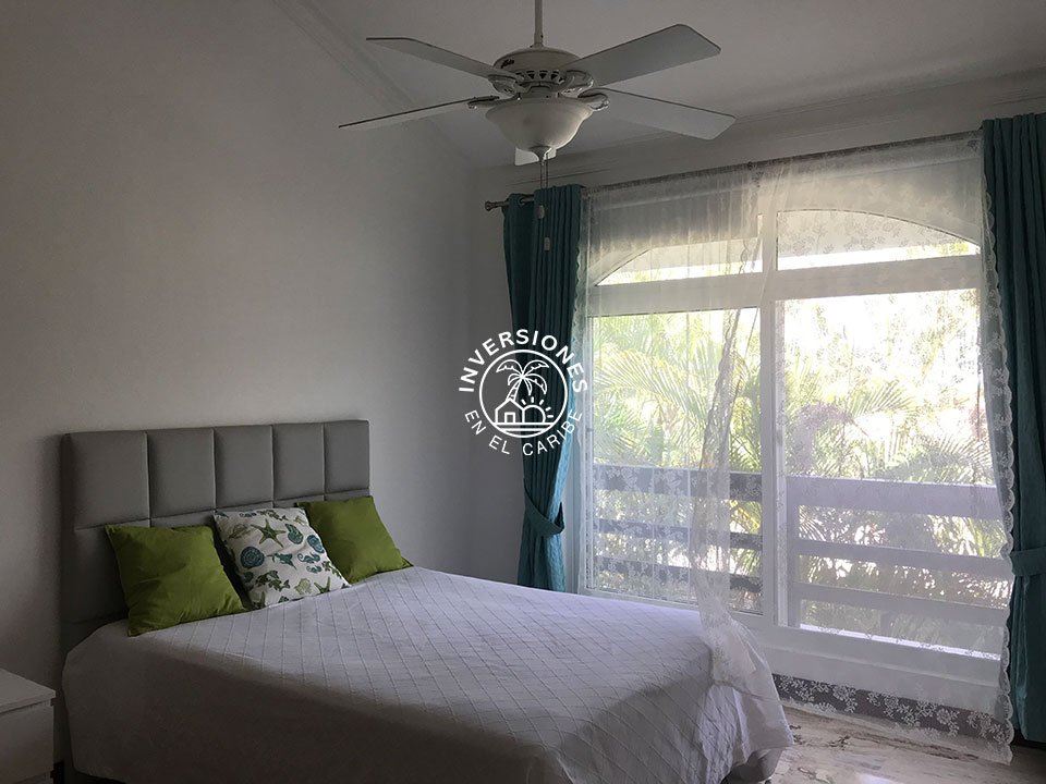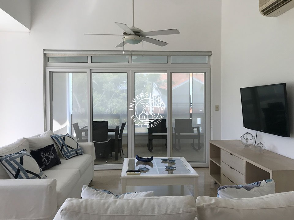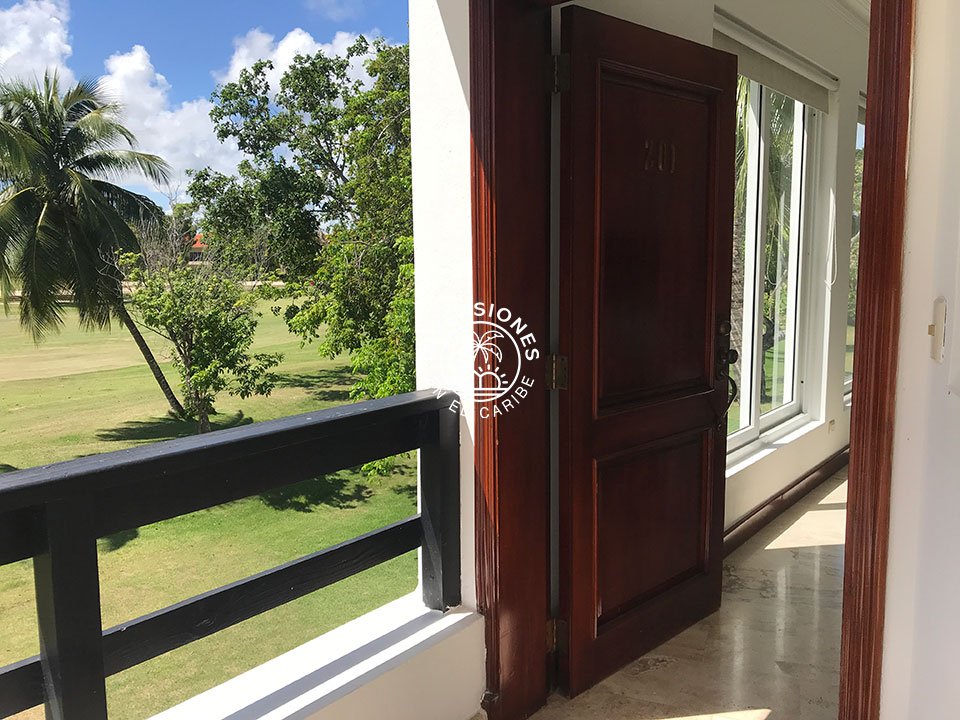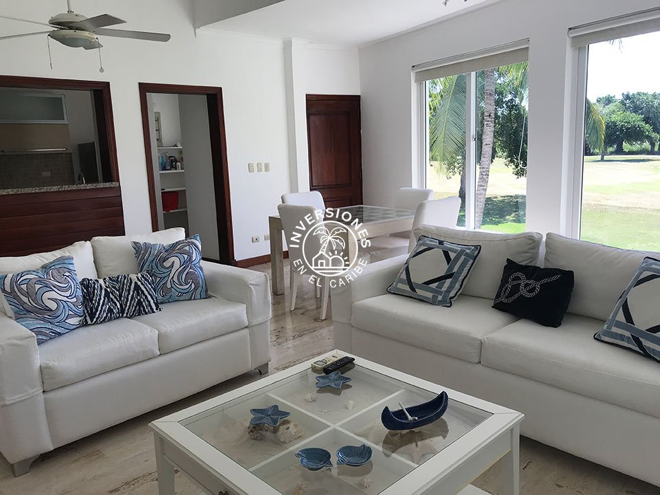 Amplio apartamento en segunda planta con vistas panorámicas al campo de golf. 3 habitaciones, 2 baños, sala, comedor, cocina, despensa, enorme terraza y una plaza de aparcamiento asignada. El apartamento está ubicado en uno de los mejores proyectos residenciales de todo Cocotal y cuenta con acabados de gran calidad. La terraza cuenta con permas enrollables para mayor privacidad, mesa comedor y sofás. Próximo a la entrada de Cocotal de la autovía. Las estancias están dotadas de abanico, aire acondicionado y mosquiteras en las ventanas y blackouts en los dormitorios. Vitrocerámica, horno eléctrico, nevera de gran capacidad y lavadora/secadora eléctrica de torre. Todo el apartamento es de mármol y las maderas son de caoba. En las áreas comunes cuenta con chaise lounges, piscina y jacuzzi. El complejo es tranquilo, ideal para quien quiere disfrutar del sosiego y vistas panorámicas al campo de golf. Renta mínima por un año. No se admiten mascotas.